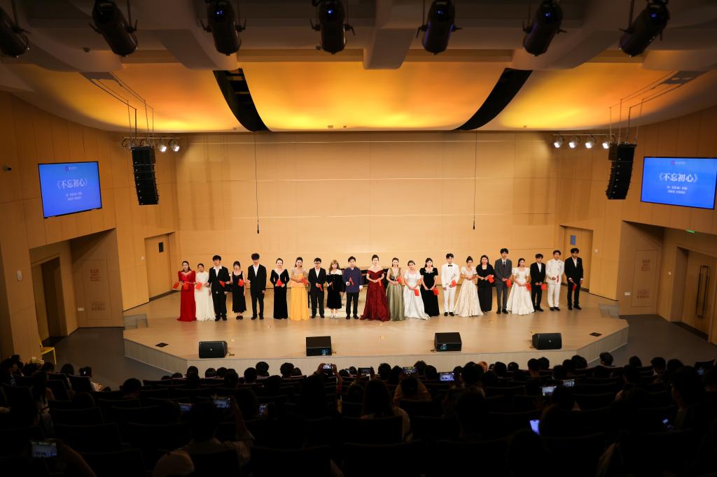 “不忘初心,继续前进,万水千山最美中国道路……”当熟悉的旋律响起,音乐会迎来最终的高潮。全体演员身着整齐服装走上舞台,与现场观众齐声高唱《不忘初心》。恢宏激昂的旋律、饱含真挚的情感,唱出了全体师生对祖国的无限热爱,更唱响了“万水千山不忘来时路”的坚定信念。展现出我校师生为实现中华民族伟大复兴的中国梦贡献青春力量的担当与豪情。
