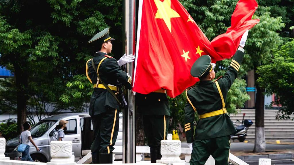 仪式伊始,国旗护卫队护送国旗入场,全场师生肃立行注目礼。伴随激昂的旋律,五星红旗冉冉升起,全体师生齐唱国歌。