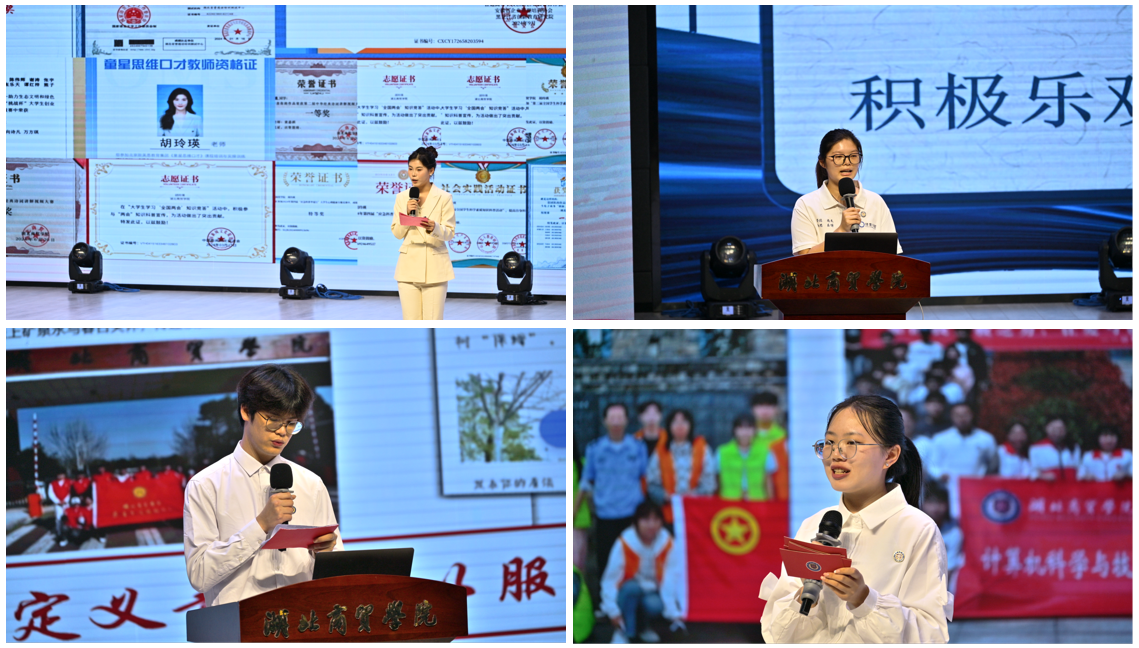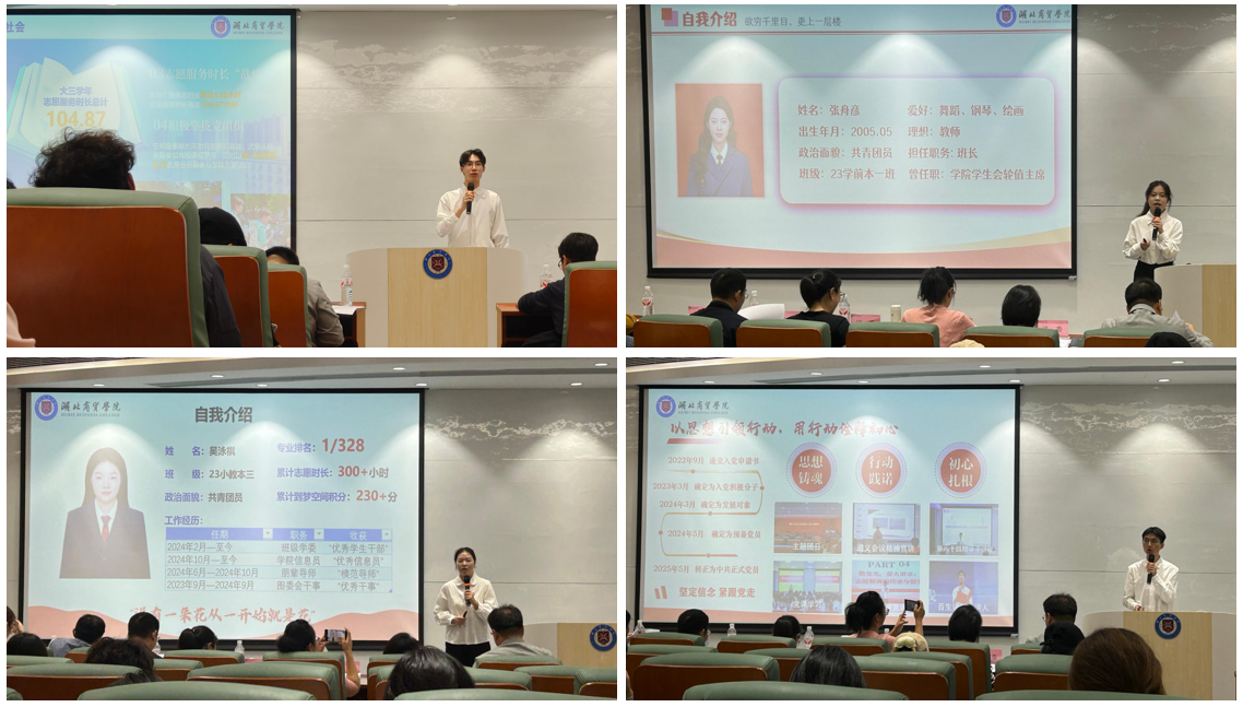 在风采展示环节,各位候选人根据抽签顺序依次登台,结合PPT进行6分钟的个人陈述。他们中,有人聚焦专业深耕,分享在学科学习、科研探索中积累的丰硕成果;有人讲述多元社会实践故事,从志愿服务到实践项目,尽显责任担当与卓越综合素养;还有人清晰梳理未来发展路径,无论是专业深造还是职业规划,都传递出对领域的坚定信念与远大抱负。每位候选人从容不迫、逻辑清晰,接连赢得观众的阵阵掌声。