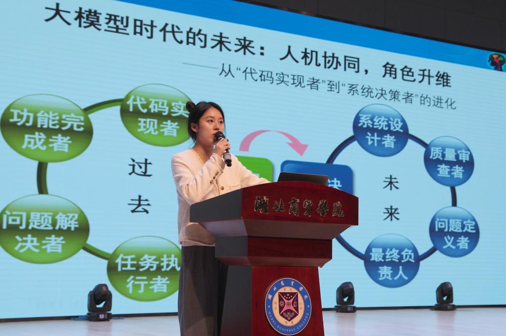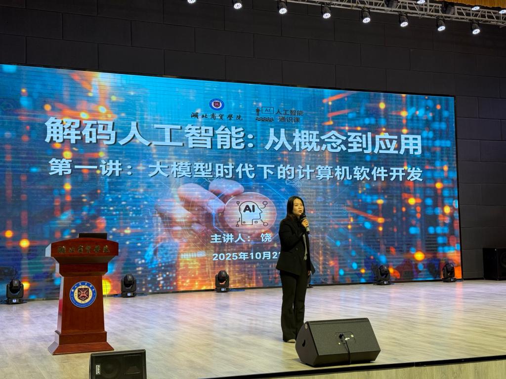 10月22日,我校人工智能通识课《解密人工智能:从概念到应用》第一讲在咸宁校区文体中心大礼堂正式拉开帷幕。副校长陈靓秋出席活动。计算机科学与技术学院饶宁老师以“大模型时代下的计算机软件开发”为题给同学们讲授了一节精彩纷呈的课堂。