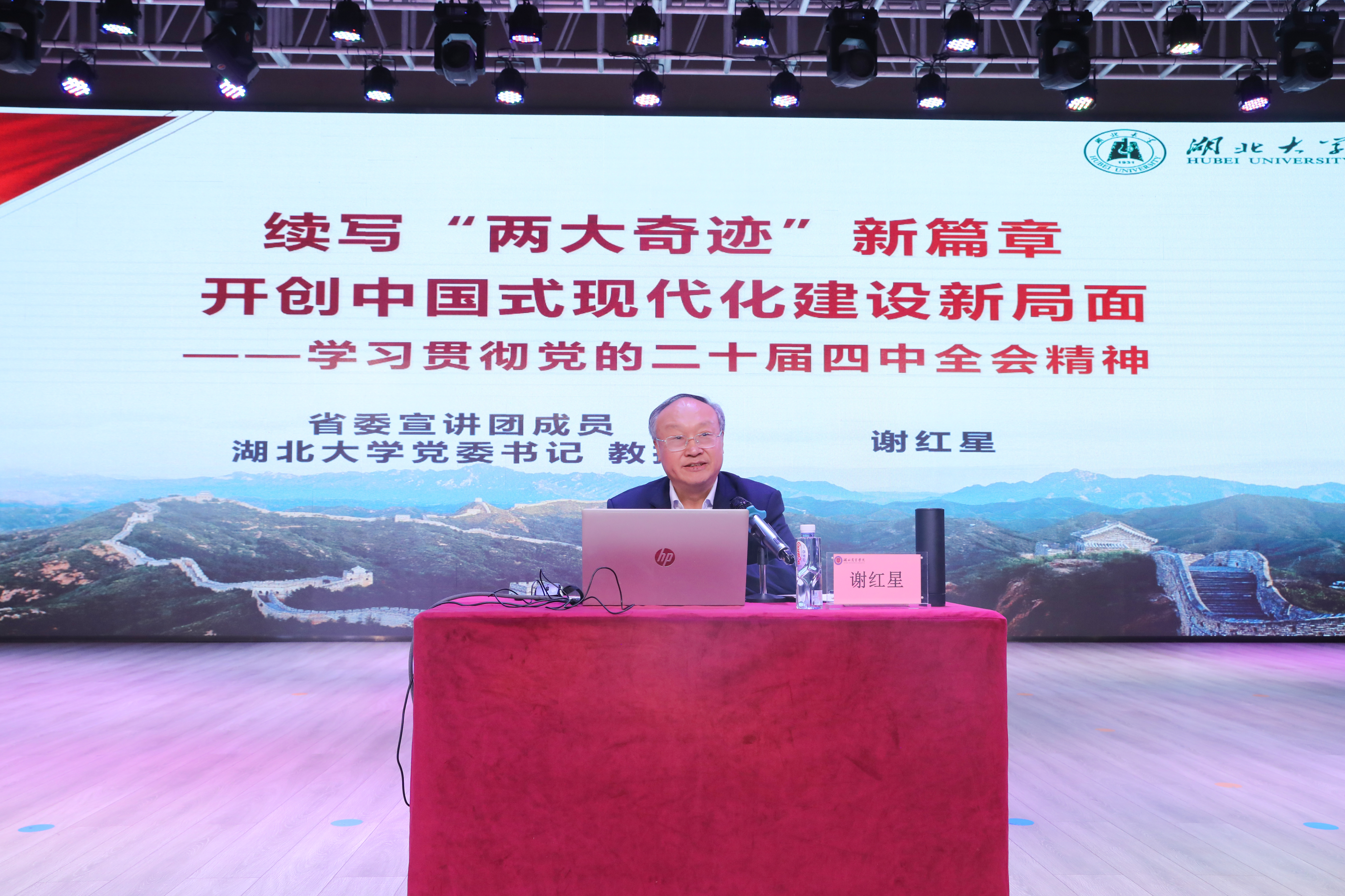 根据学校党委工作部署,11月13日,我校邀请湖北大学党委书记、省委宣讲团成员谢红星教授来校宣讲党的二十届四中全会精神。报告会由校党委书记杨世雄主持。报告会设武汉校区、咸宁校区两个会场,全体校领导、党委委员、纪委委员,各部门、各学院党员干部、民主党派负责人和师生代表等1000余人参加。