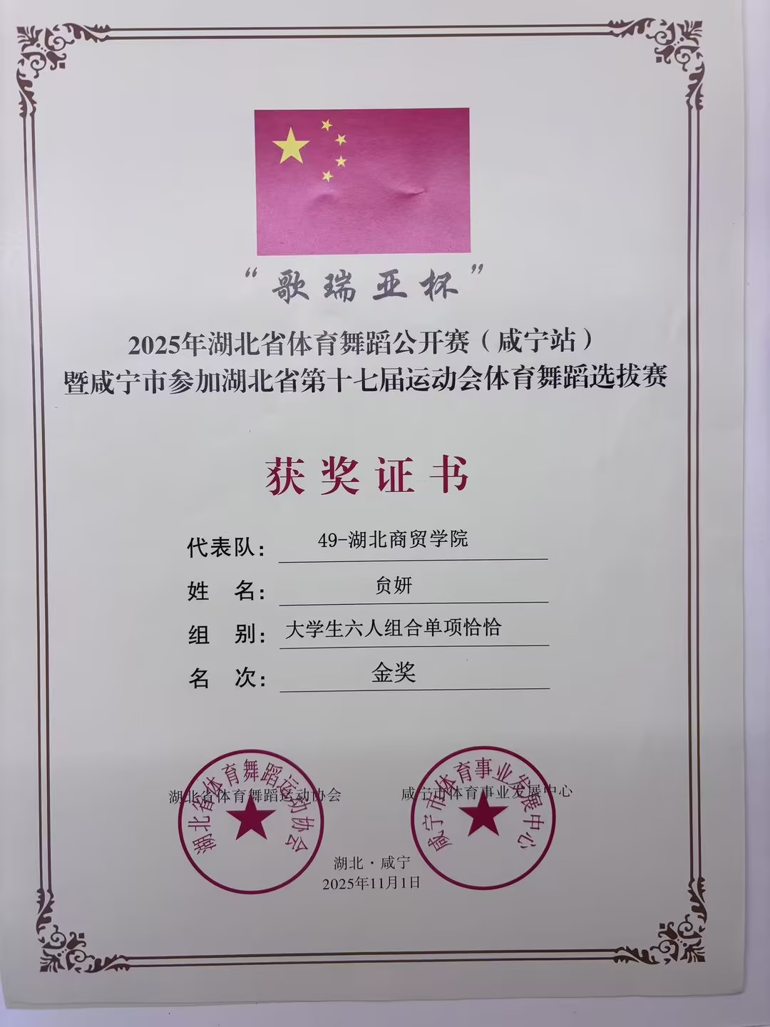 近日,“歌瑞亚杯”2025年湖北省体育舞蹈公开赛(咸宁站)暨咸宁市参加湖北省第十七届运动会体育舞蹈选拔赛在湖北咸宁圆满落幕。城市建设学院学子贠妍表现亮眼,所在团队凭借扎实的功底与默契的配合,一举斩获大学生六人组合单项伦巴金奖、大学生六人组合单项恰恰金奖两项殊荣。