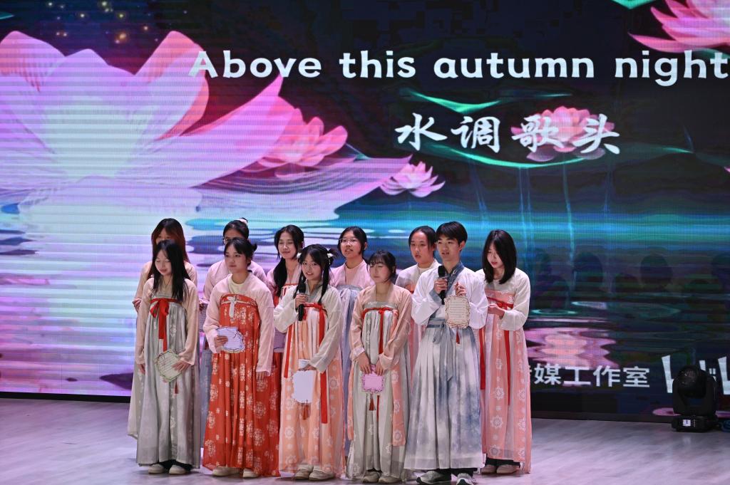 文艺汇演环节精彩纷呈,为现场观众献上了一场高品质的视听盛宴。开场舞蹈《Midas Touch》活力四射,舞者热情灵动,展现青春风采,点燃全场气氛;短视频《荆楚文化传播·AI赋能创新》以英文讲解和精美画面,带领观众沉浸式体验荆楚文化魅力;英文歌曲串烧《Darl+ing》节奏明快,展现青春风采。
