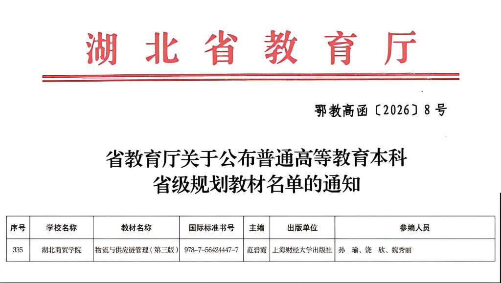近日,湖北省教育厅正式公布普通高等教育本科省级规划教材遴选结果,我校范碧霞老师主编的《物流与供应链管理(第三版)》教材成功入选。