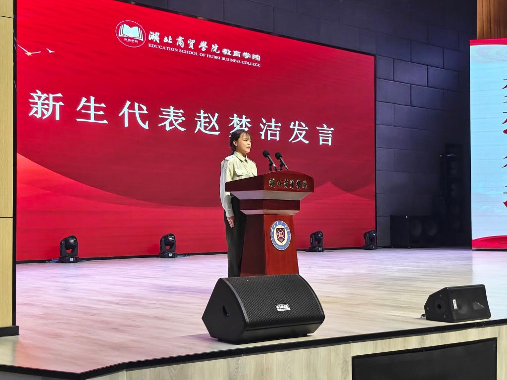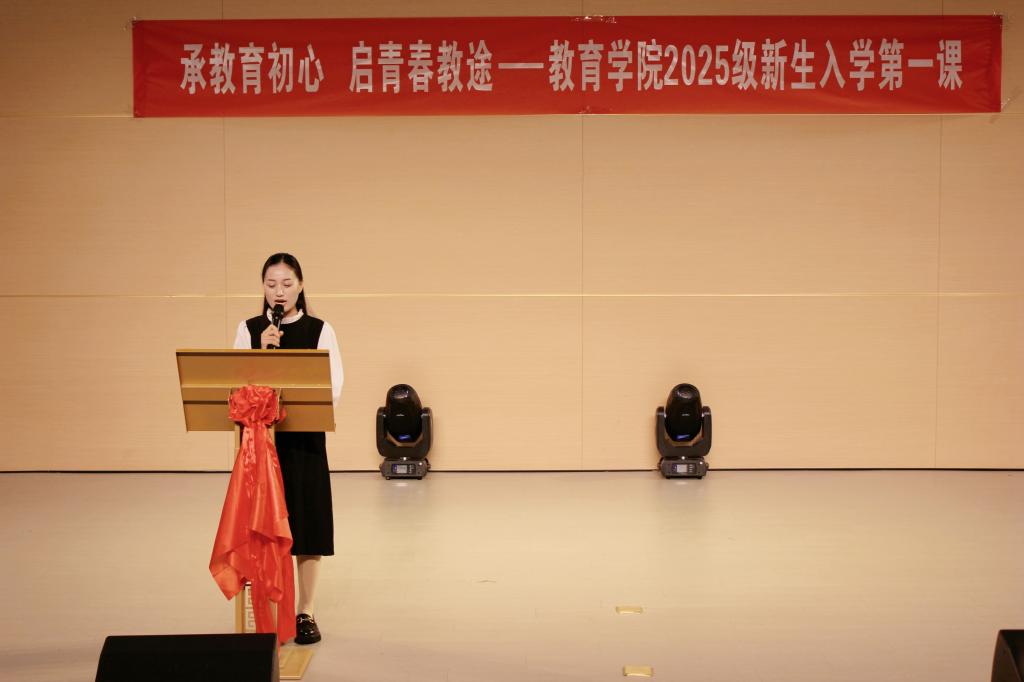 新生代表赵梦洁、葛美欣纷纷分享入学感受,从“辅导员的贴心帮助”,到“校园环境与友善氛围带来的归属感”,字里行间满是对大学生活的期待。她们共同号召全体新生以“空杯心态”投入学习,主动参与“教育实践工作坊”“师范生技能大赛”等活动,珍惜校区优质资源,在实践中锤炼能力。