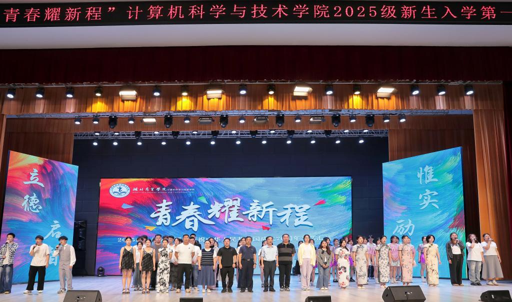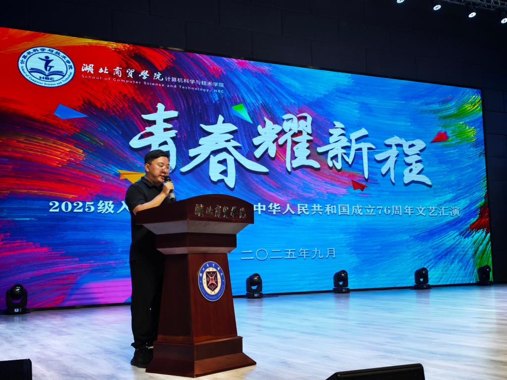 9月29日晚,计算机科学与技术学院在咸宁校区文体中心隆重举办“‘青春耀新程’2025级新生开学第一课暨庆祝中华人民共和国成立76周年文艺汇演”。副校长肖坤出席活动,学工处副处长刘红刚、校团委副书记徐辉、计算机科学与技术学院党政班子、全体辅导员及教师代表与全体新生齐聚一堂,共同参与这场集思想引领、专业启蒙、文化熏陶于一体的育人活动,为新生开启大学生涯新篇章奠定坚实基础,以实际行动践行红色教育使命,向祖国华诞致以崇高敬意。