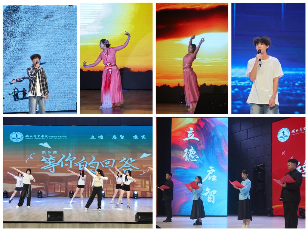 独唱《追梦赤子心》以动人歌声传递青春力量,鼓励新生以理想为帆、以奋斗为桨,在大学时光中绽放光彩;舞蹈《等你的回答》以温柔细腻的演绎,诠释青春对未来的憧憬与探索,表演期间,学院咸宁校区全体辅导员集体亮相,为新生送上成长寄语与美好祝福,让新生感受到学院的关怀与温暖;男生合唱《平凡之路》以朴实歌词与深情演唱,引导新生树立脚踏实地、逐梦前行的人生态度;串烧独舞《红韵华章》极具匠心,巧妙融合《我爱你中国》《唱支山歌给党听》《小河淌水1952》等经典红色歌曲,舞者以肢体语言复刻红色记忆、诠释爱国深情,将对祖国的热爱与对革命先烈的崇敬融入每一个动作,现场感染力十足,让红色精神深入人心。