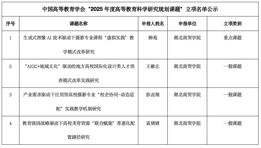 2025年10月,中国高等教育学会发布了2025年度高等教育科学研究规划课题立项名单,艺术与传媒学院在此次申报中表现突出,共有四项课题成功获得立项,其中包括一项重点课题与三项一般课题。