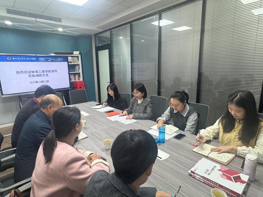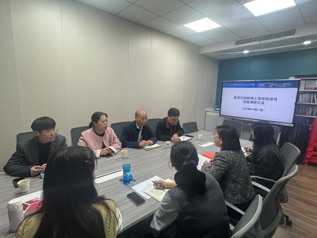 10月23日上午,蚌埠工商学院现代教育中心主任马新民、财务与会计学院院长宋在科、副院长胡晓平等一行4人来访我校会计学院,开展考察交流活动。学院院长郑晓燕教授、教研室主任及实验员热情接待了来访嘉宾。双方围绕人才培养模式创新、教学质量保障体系构建、产教融合实践等议题进行了深入交流。