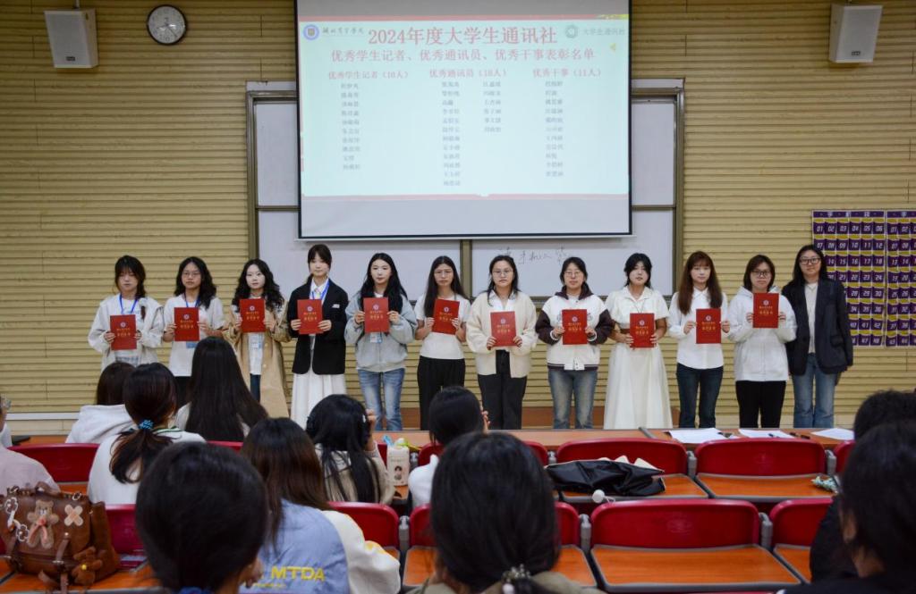大会宣读了《关于聘任大学生通讯社2024届干部的决定》,对数十名上2024届学通社优秀社员、优秀学生干部进行了表彰,并进行了庄严的聘书颁发、新社员记者证授牌和集体宣誓仪式,全体社员承诺:胸怀祖国,忠于人民。勤奋学习,求实创新。树立马克思主义新闻观,坚守新闻人的崇高理想,牢记新闻传播者的初心使命。恪尽职守,纪律严明。砥砺前行,逐梦新时代。做一名有担当、有格局、有情怀、有本领的大学生新闻工作者。