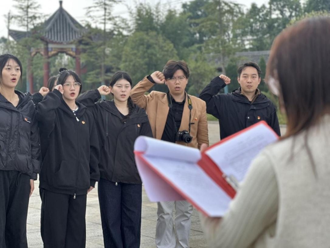 随后,预备党员代表刘笑言发言,表达了对革命先烈的深切追思和继承遗志、砥砺前行的坚定决心。在党总支副书记金益与学生团员代表成叶萱的共同领誓下,全体师生分别重温了入党、入团誓词。纪念碑前,铿锵誓言回荡,传递着信仰的力量与精神的传承。进一步筑牢了师生理想信念根基,激励大家在新征程中坚守初心、担当使命,不断锤炼忠诚政治品格。