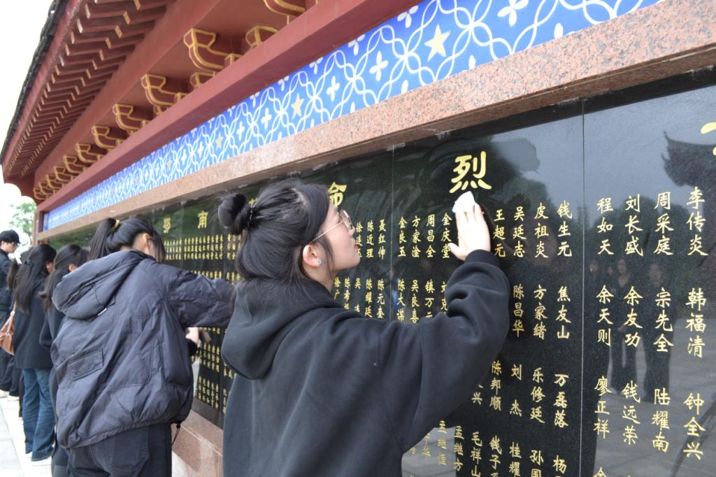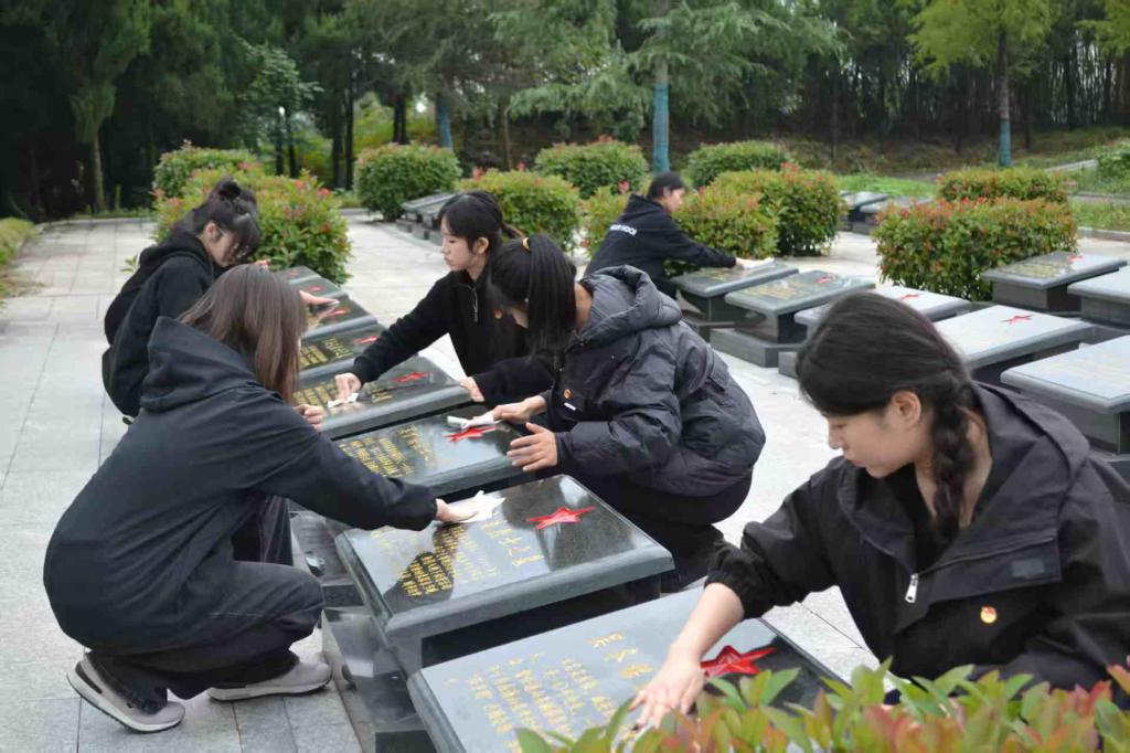 宣誓仪式后,师生们细致擦拭烈士墓碑,认真清理纪念碑周边环境。同学们神情庄重,俯身轻拭尘灰,使碑文重现光辉,并在每一位烈士墓前驻足瞻仰,深切缅怀革命先辈的丰功伟绩。清扫过程不仅是对烈士安息之地的维护,更是一次深刻的精神洗礼。整个纪念碑区域在师生共同努力下,更显庄严肃穆。地砖上的一句“我们和我们的子孙会常来这里”,更是感动了前来扫墓的师生们,在实践感悟中传承了红色基因,增强了爱党爱国情怀。