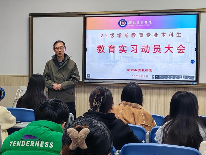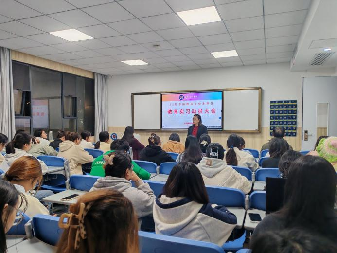 武汉校区动员大会于10 月 30 日晚 6:30 正式举行,教育学院副院长金敏、教研室主任郝一双、副主任张俊南及教师董洁出席会议。会上,金敏发表动员讲话,着重强调教育实习是学前教育专业学生成长的“关键一课”。他表示,实习是实现理论知识向实践能力转化的核心环节,寄语同学们在实习中深耕专业基础、锤炼教学技能,为未来投身教育事业积累扎实经验。