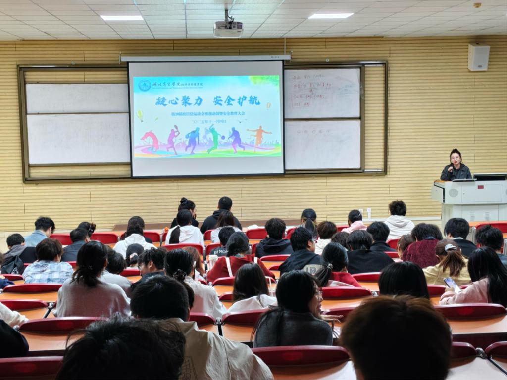 为迎接即将到来的第20届田径运动会,激发运动员参赛热情,并强化安全意识,11月4日-5日,经济与管理学院咸宁、武汉校区同步召开赛前动员暨安全教育大会。学院党总支副书记郑燕培、分团委书记戴小雨、辅导员王开涛老师及全体参赛运动员参加会议。