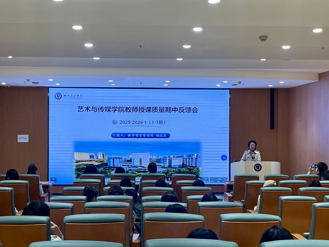 为深入贯彻落实立德树人根本任务,持续提升教育教学质量与育人水平,艺术与传媒学院于11月5日在图书馆一楼报告厅隆重召开2025-2026学年第一学期期中教学质量反馈会。学校教学质量管理处处长督导姚范美、艺术与传媒学院院长张亚南、党总支书记刘玉洁、副院长汤池明、副院长袁航及学院全体教职工齐聚一堂,共同探讨教学改进与提升之道。会议由副院长汤池明主持。