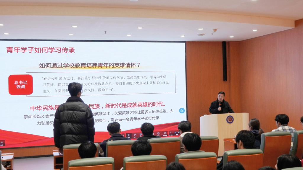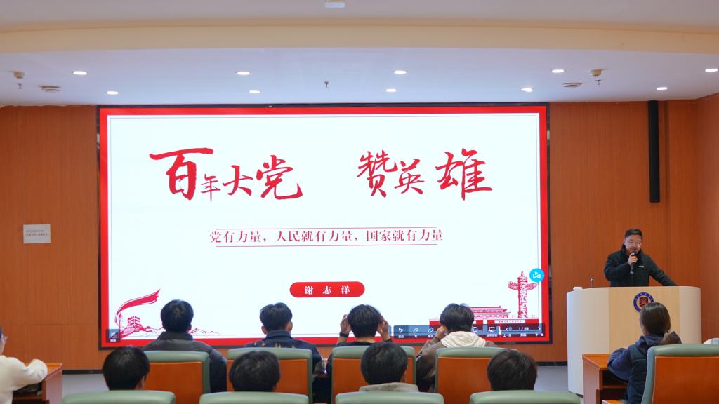 谢志洋以“百年大党 赞英雄”为题,纵览革命、建设、改革三大历史时期,层层深入地讲解了英雄精神的本质、弘扬的价值与实践方法,从“什么是英雄精神”、“弘扬英雄精神的意义”、“如何弘扬英雄精神”、“青年学子如何学习英雄精神”着重引导青年学子思考如何传承,其讲解声情并茂,富有感染力。