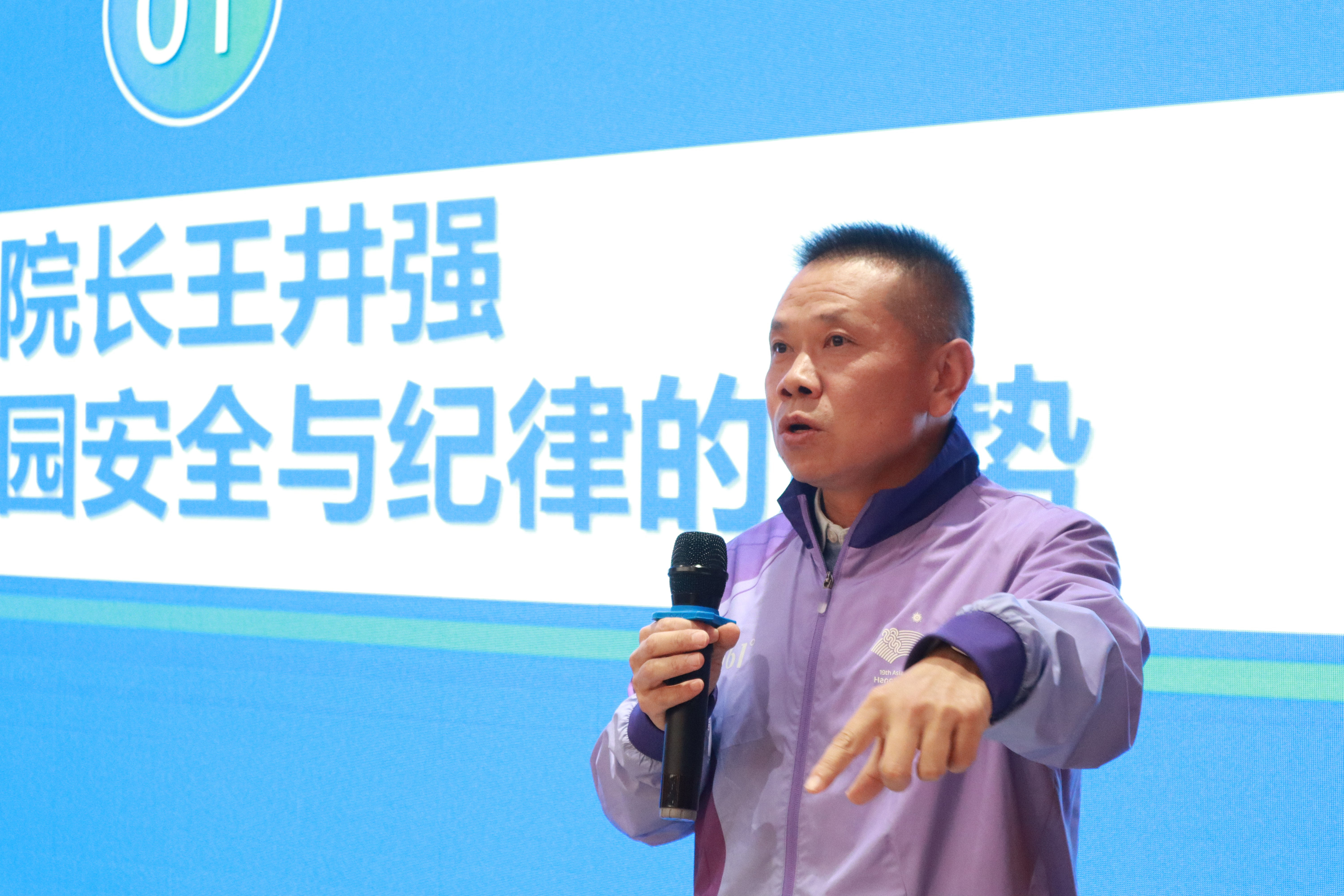 在武汉校区,王井强结合当前校园安全热点问题,详细解读了运动安全、财产安全、宿舍矛盾、防诈骗等多个安全议题,系统阐释了安全教育的必要性和紧迫性。他表示,典型案例的发生,既有风险认知的盲区,更有责任意识的淡薄。针对存在的突出问题,他对全体参会学生提出四点要求:一是要当好班级的“信息员”;二是要当好班级的“宣传员”;三是要当好班级的“维护员”;四是要当好班级的“协调员”。