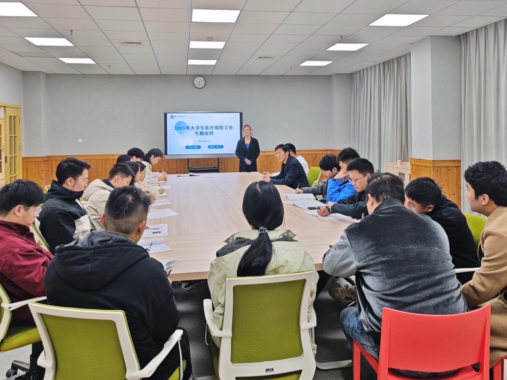 为进一步保障我校大学生基本医疗需求,提升学生健康保障水平,11月17日上午,在咸宁校区行政楼会议室开展2025年大学生医疗保险工作专题培训会。培训会由闫明倩主持。