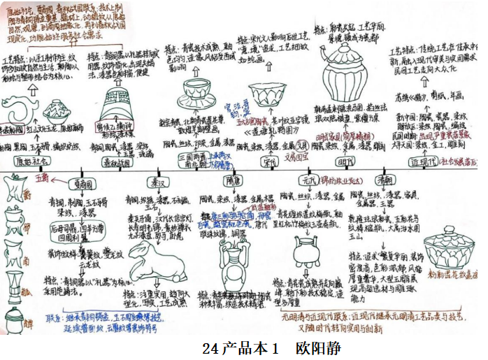 工整系统型: 条理清晰,重点突出,利用不同颜色的笔迹、手绘等方式展示不同时期中国工艺美术特点,将复杂的发展体系梳理得井井有条;