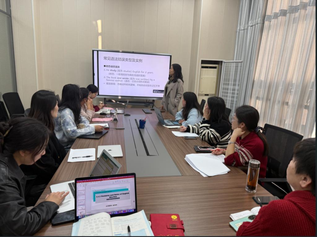 研讨会由教研主任邓妍主持,陈惠君老师主讲,英语综合教研室全体教师参与。会议聚焦于语法高频错误的类型、成因与教学对策,与会教师结合英语基础写作、英语语法、综合英语等不同课程的教学场景,分享了“非谓语动词使用混淆”“时态语态混淆”和“从句连接词误用”等典型案例,并深入探讨“错误案例归类分析”“语法规则情境化演练”“错题本积累”等教学实践方案。