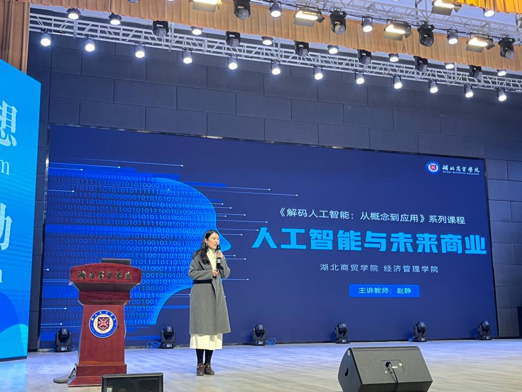 12月3日,人工智能通识课《解密人工智能:从概念到应用》第三讲在咸宁校区文体中心大礼堂顺利举行。教务处副处长谢松、经济与管理学院院长严良、副院长徐刚、党总支副书记郑燕培参加活动。本次课程的讲座由经济与管理学院赵静老师主讲,围绕人工智能产业趋势与商业应用展开深度解析。