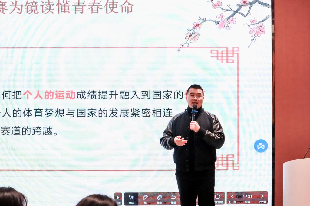 孙银龙以“赛场即战场:湖商体育青年的使命答卷”为题,引用习近平总书记“体育强则中国强,青年强则国家强”的时代之音。围绕湖商体育精神的坚实根基、湖商体育精神的赛场答卷讲解了如何把个人的运动成绩提升、融入到国家的体育强国建设中,将个人的体育梦想与国家的发展紧密相连,实现从校园跑道到强国赛道的跨越。