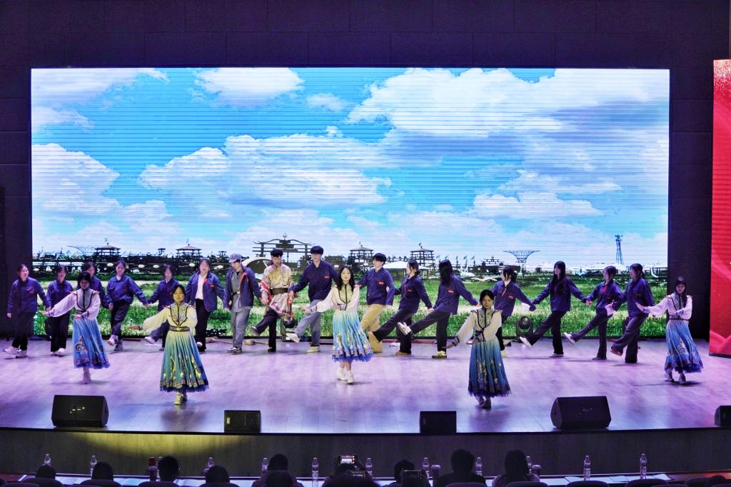 汇演开场表演《一朵红的花》以悠扬的小提琴声缓缓引入,舞者们伴随着工作人员手持旗杆轻轻摇动的党旗,依次有序地起身,画面既庄重又鲜活。