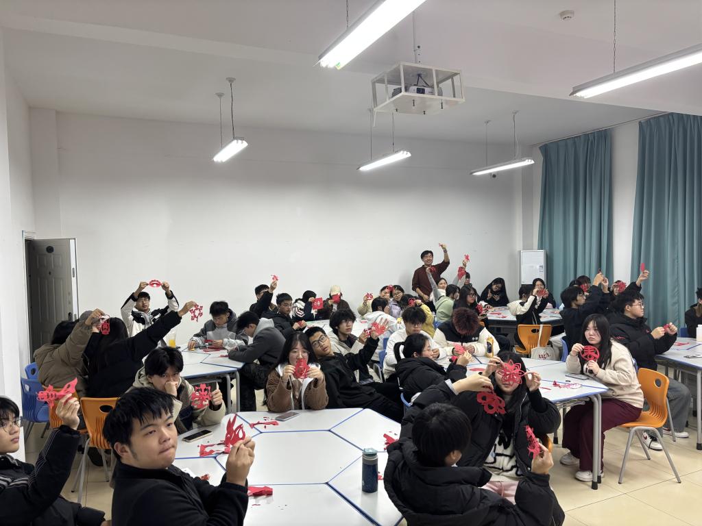 活动还设置了“猜灯谜”与“剪纸展示”环节。朱祎老师带领学生竞猜英语灯谜,学生在轻松游戏中锻炼英语思维。随后,秦丹丹老师展示剪纸作品,并讲解其图案背后的吉祥寓意,学生现场尝试剪制窗花,亲身感受这项非物质文化遗产的独特魅力。最后,大家共同学习了常用春节祝福语的中英文表达,并在温馨愉快的氛围中合影留念,为本次活动画上圆满句号。