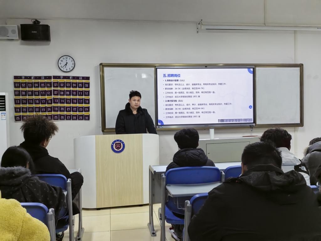 为积极拓展毕业生就业渠道,搭建优质校企对接平台,12月14日晚18时30分,由学校招生与就业指导处发起、会计学院具体承办的企业招聘宣讲会在湖北商贸学院咸宁校区XJB-102教室顺利举行。本次活动旨在精准服务学生就业需求,促进2026届毕业生更充分、更高质量就业。