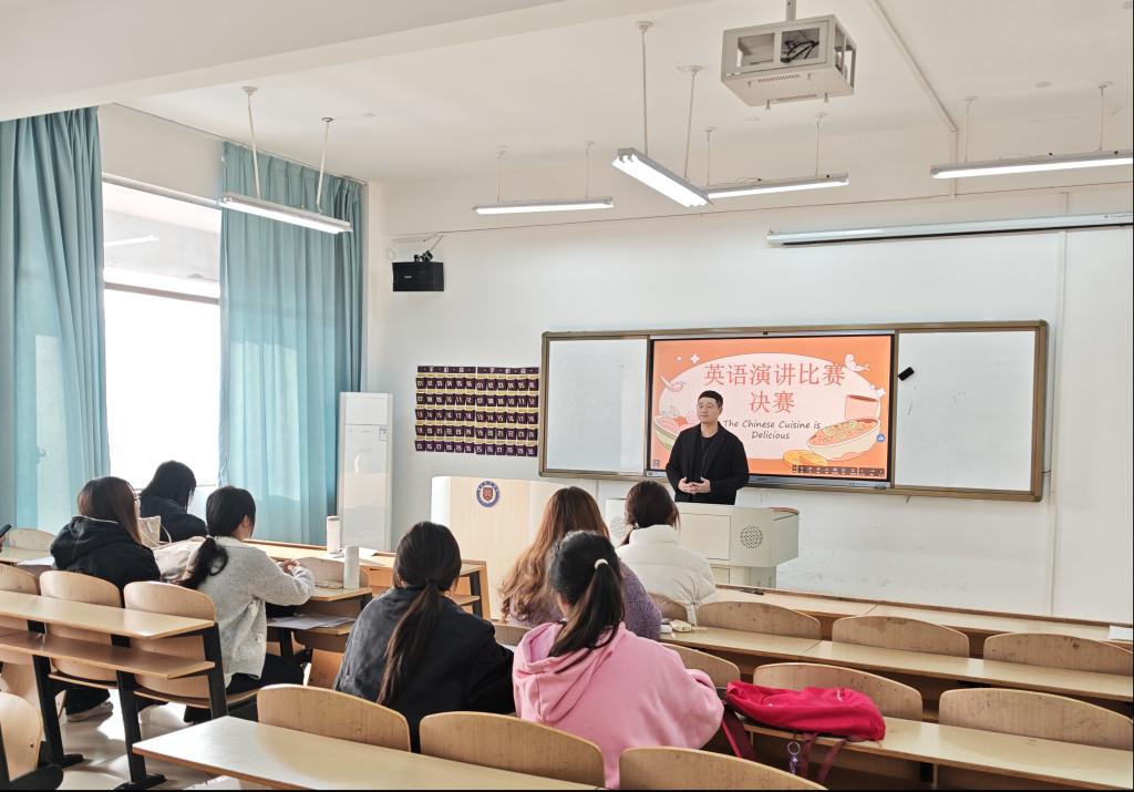12月11日,由外国语学院主办的英语演讲比赛决赛圆满落幕。本次比赛以“Chinese food is delicious”为主题,旨在通过英语演讲展现中华美食的丰富内涵与文化魅力,同时也给学生提供一个展现自我,提升自我的机会和舞台。决赛特邀黄延康、周丝两位老师担任评委,罗甜甜老师负责全程指导学生演讲稿与ppt的准备工作。初赛阶段由黄延康、张梦莹老师担任评委,四位老师共同为比赛的顺利开展提供了有力支持。