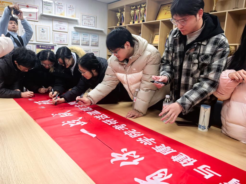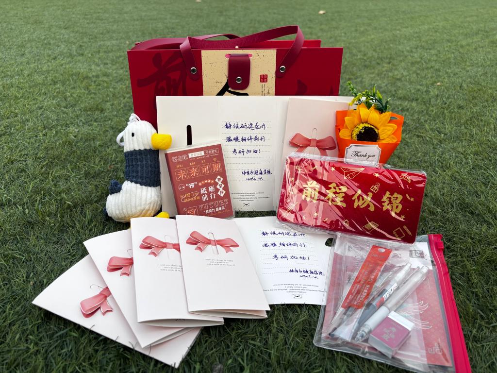 学院精心准备的考研“加油包”更是心意满满:配备齐全的考试文具、印有“前程似锦”的暖身用品、象征阳光与希望的向日葵花束、由党总支书记刘冰清亲笔书写寄语的贺卡、寓意积极向上的“加油鸭”玩偶以及寄托“未来可期”的纪念笔记本。每一份礼物都承载着学院的深情嘱托与美好祝愿。发放现场,学院团委组织学生骨干手持啦啦球,环绕考研学子送上“一路生花”的真诚助威,场面温馨而鼓舞人心。