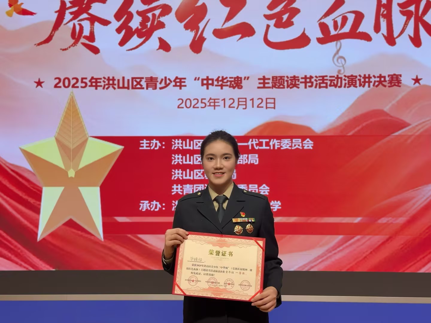 近日,由关工委联合区委老干部局、区教育局、团区委共同举办的2025年洪山区青少年“中华魂”主题读书活动演讲决赛在洪山区广埠屯实验小学圆满收官。经济与管理学院退役女兵毕婧怡凭借作品《二万五千里外的选择》,以铿锵有力的表达、真挚深沉的情感和独特的军旅视角,在一众参赛选手中脱颖而出,荣膺青年组一等奖,尽显新时代退役大学生士兵的青春担当与家国情怀。