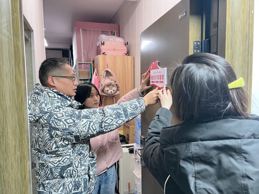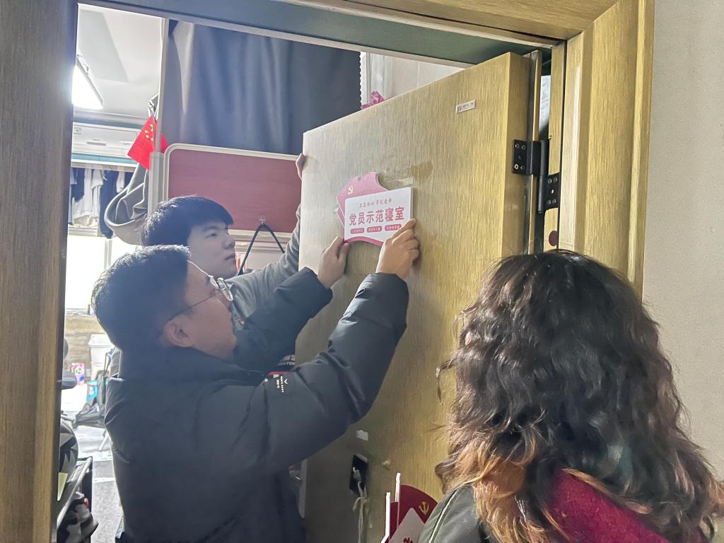 谢志洋为党员示范寝室挂牌,并向学生党员们强调,党员示范寝室铭牌虽然不大,但其背后的意义却十分重大。铭牌象征着责任与担当,象征着形象与身份,提醒着同学们务必不忘初心、牢记使命。学生党员务必充分发挥先锋模范作用,积极团结带领身边同学在学术科研、文明宿舍创建、校园活动参与等方面奋勇争先,努力营造积极向上、充满活力的宿舍文化氛围。