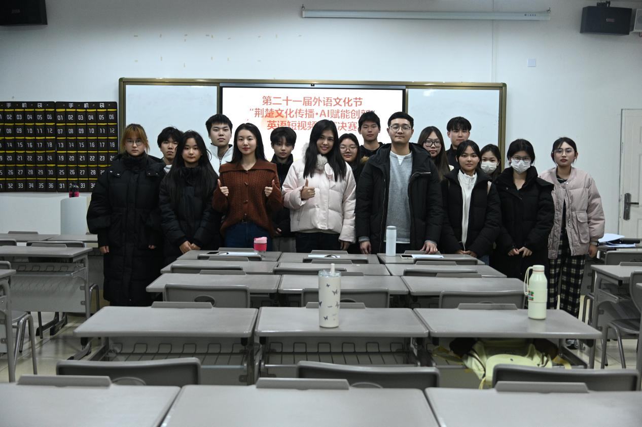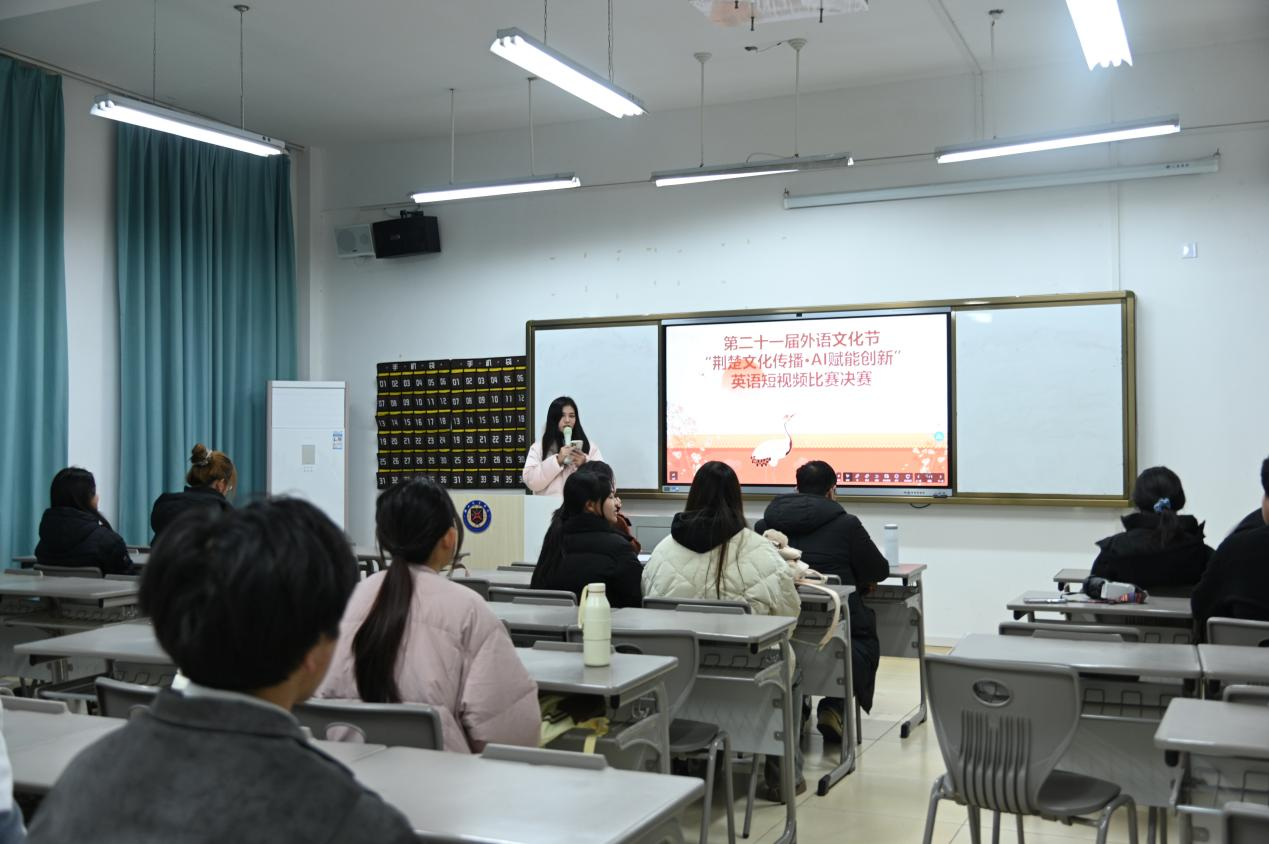 12月17日下午,由外国语学院主办的第21届外语文化节英语短视频大赛决赛在咸宁校区C101举行。本次大赛旨在鼓励学生运用英语讲述荆楚故事,是外国语学院“外语+人工智能赋能荆楚文化国际传播研究”系列活动之一。王冯骏子老师担任总决赛主持人,张梦莹、黄延康两位老师担任评委。赛事以"荆楚文化·AI赋能创新"为主题,吸引多支学生团队围绕编钟、糖画、楚绣等题材展开创作,用英语讲述荆楚故事,用镜头碰撞人工智能,为现场师生呈现了一场传统与未来交织的视听盛宴。