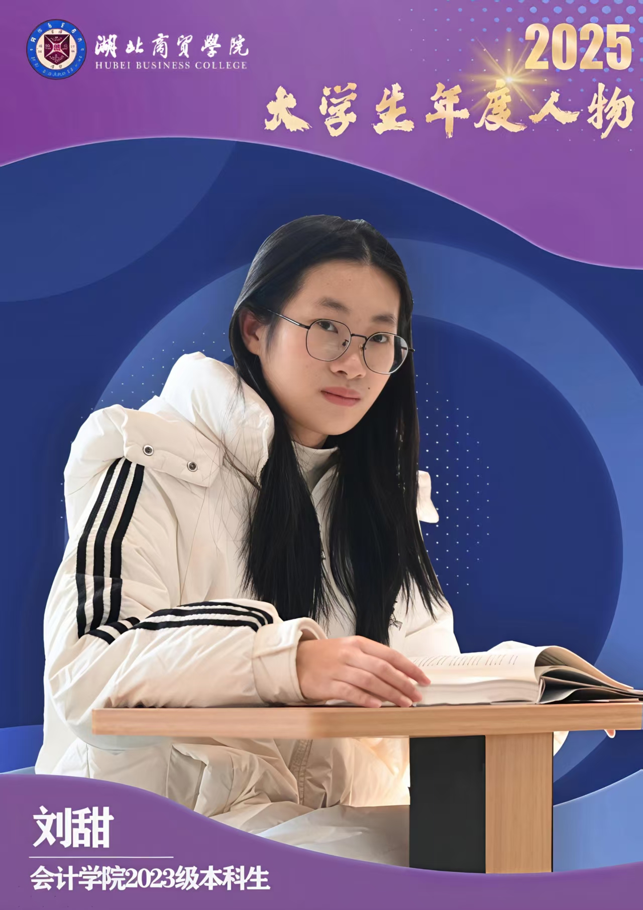 刘甜同学系会计学院2023级会计学本科1班学生,共青团员。她出身江西上饶农村,心怀感恩,笃志躬行,在学业、竞赛、实践等多个维度绽放光彩。学业上,她刻苦钻研,成绩斐然,从大一专业第二跃升至大二专业第一,连续获得国家奖学金、国家励志奖学金,荣获“十佳学子-学习之星”“优秀共青团员”等称号。她注重知行合一,积极投身学科竞赛,在“挑战杯”、全国大学生智慧财经大赛、“立信杯”会计技能大赛等国家级、省级赛事中累计获奖十余项,并考取初级会计师、银行业专业人员职业资格等多项证书。同时,她热心志愿服务,担任班级教学信息员,在服务集体与社会中涵养情怀、锤炼品格,生动诠释了新时代青年“勤学、修德、明辨、笃实”的优秀品质。