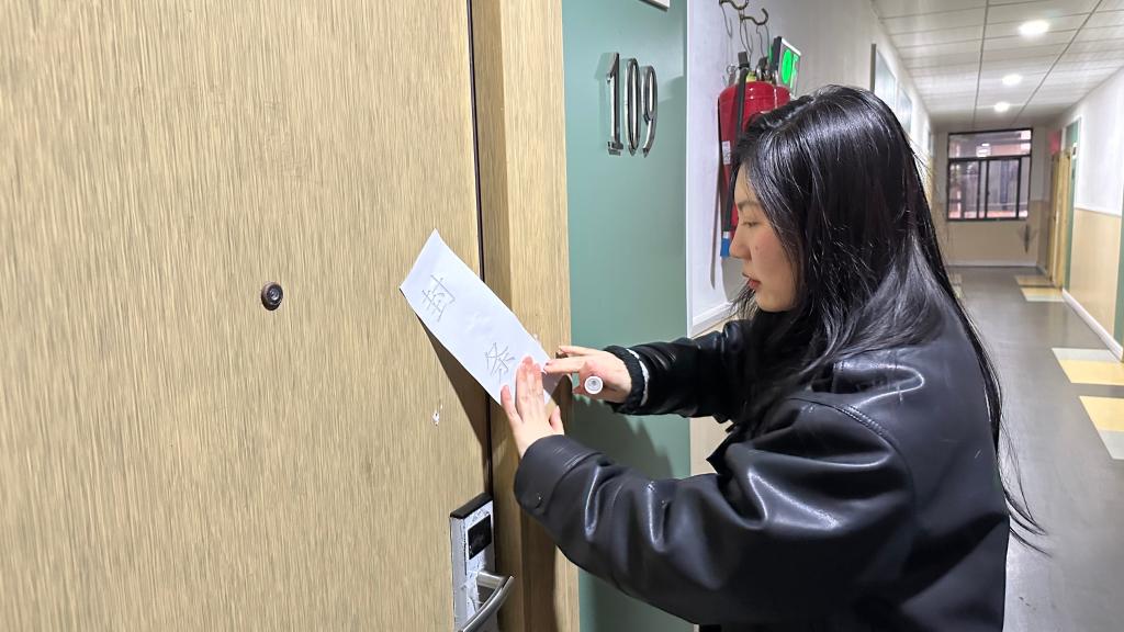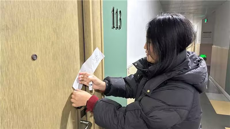 尤为温馨的是,本次活动特别融入了传统文化元素。学院提前组织有书法特长的教师挥毫泼墨,书写了一批承载着新春祝福与励志勉励的原创对联与“福”字。走访过程中,王珉与辅导员们亲手将一副副墨香四溢的春联张贴于学生寝室门廊。“春光无限”“才喜双临”……一副副对联不仅寄托着老师们对学子学业有成、品格高洁的殷切期望,也为略显冷清的离校宿舍楼增添了浓浓的节日暖意与文化气息。王珉表示,贴封条是管理的需要,贴对联是温情的传递,一“封”一“贴”之间,体现的是学院严管与厚爱相结合的学生工作理念,旨在让教育更有温度,让管理更富内涵。