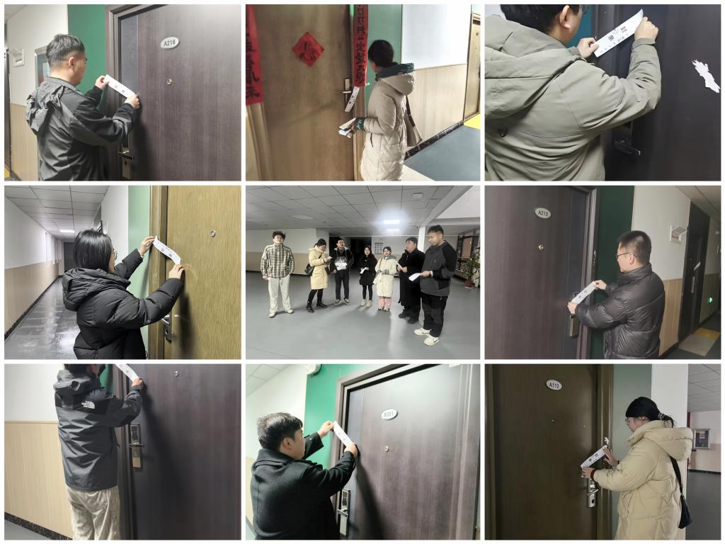 全体辅导员对宿舍逐一开展检查并张贴封条。工作过程中,辅导员们认真核对宿舍人员的离校情况,仔细检查宿舍门窗是否关好、水电是否关闭,以及是否存在安全隐患。在确认宿舍安全无误后,辅导员们将封条平整地张贴于宿舍门锁处。