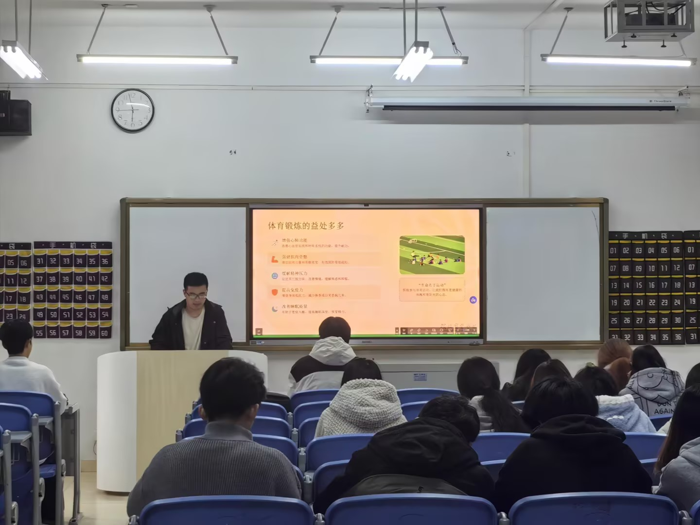 班会上,辅导员围绕身心健康、日常防护、作息管理、饮食健康、情绪调节等核心内容展开讲解,结合大学生学习生活实际,科普科学作息、合理膳食、适度运动的重要性,提醒同学们摒弃不良生活习惯,主动做好个人健康防护,学会疏解学习、生活中的负面情绪,保持积极乐观的心理状态。同时,辅导员向学生告知校园医务室电话、校园报警电话,方便学生遇到突发健康、安全问题时及时求助。