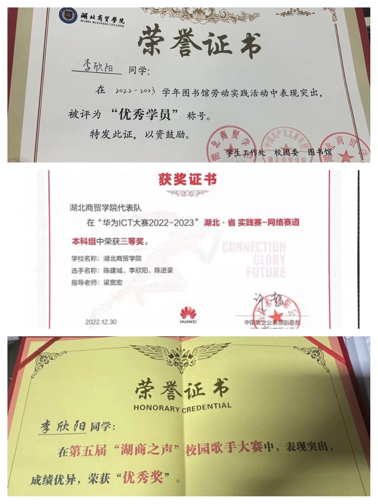 李欣阳的求学历程并非一帆风顺,高考的失利没有让他放弃追求知识的脚步。在湖北商贸学院咸宁校区,李欣阳会积极参与各类文艺活动和社会活动。其中校园十佳歌手大赛的经历让他收获颇丰,不仅获得优秀奖,还结识了许多志同道合的朋友,极大地丰富了他的人生阅历。在专业学习上,他辛勤耕耘,绩点达到3.37,并且在华为ICT网络赛道获得省三等奖,这充分展示了他在计算机领域的才华和努力。