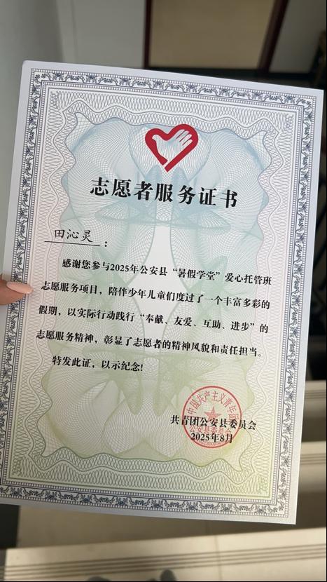 当夏日的阳光洒满大地,有一群青年以志愿之名,奔赴一场与孩子们的夏日之约。我校的田沁灵同学便是其中一员,她积极投身湖北省爱心托管班志愿服务活动,用爱心与智慧,为孩子们的暑期生活增添了绚丽的色彩,奏响了一曲动人的青春奉献之歌。